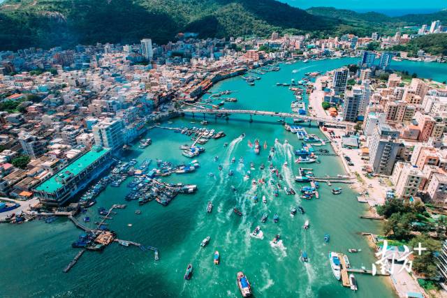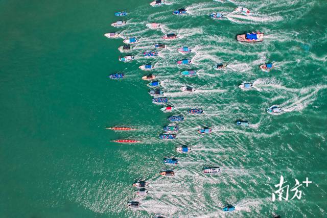 9时13分,随着一声令下,霎时锣鼓震天、鞭炮齐放,两艘龙舟冲了出来,桡手们奋力挥桨击水。紧随其后,上百条载着游客的渔船也随之出发。
