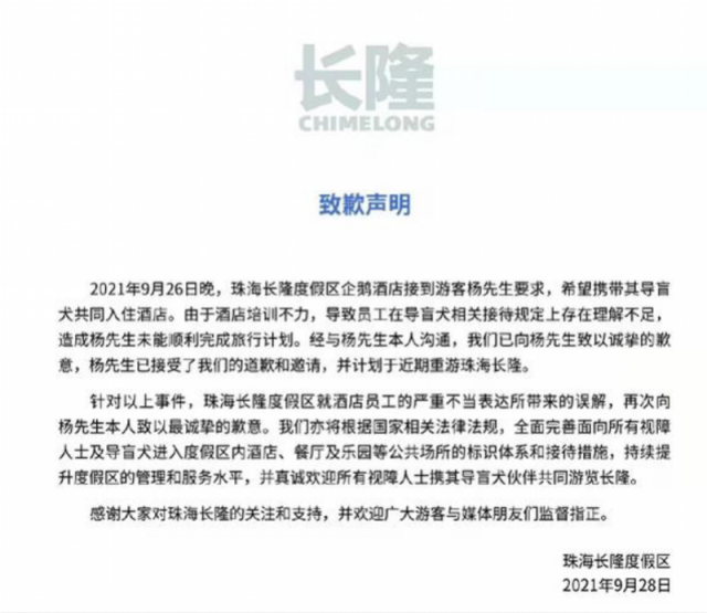 9月28日凌晨,珠海长隆度假区发布致歉声明称,9月26日晚,珠海长隆度假区企鹅酒店接到游客杨先生要求,希望携带其导盲犬共同入住酒店。由于酒店培训不力,导致员工在导盲犬相关接待规定上存在理解不足,造成杨先生未能顺利完成旅行计划。