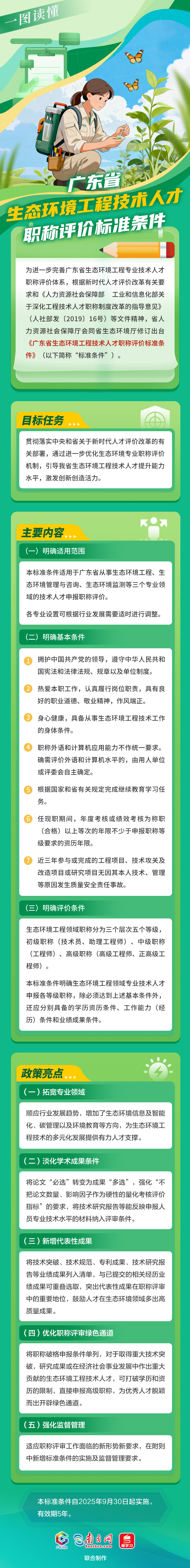 近日,广东省人力资源和社会保障厅会同广东省生态环境厅修订出台《广东省生态环境工程技术人才职称评价标准条件》(简称《标准条件》)。《标准条件》的主要内容是什么?有哪些亮点?一图了解!