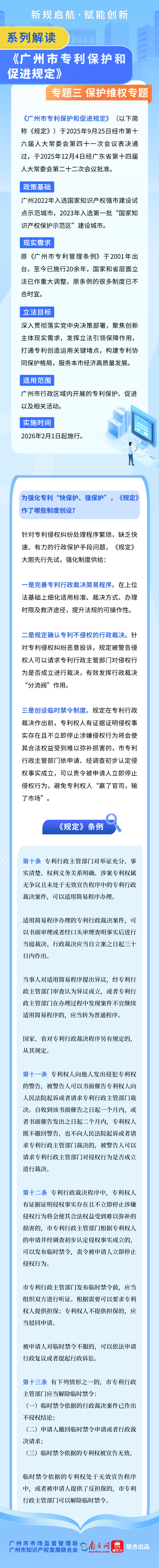 《广州市专利保护和促进规定》(以下简称《规定》)将于2026年2月1日起施行。《规定》深入贯彻落实党中央决策部署,聚焦创新主体现实需求,发挥立法引领保障作用,打通专利创造运用关键堵点,构建专利协同保护格局,服务广州市经济高质量发展。