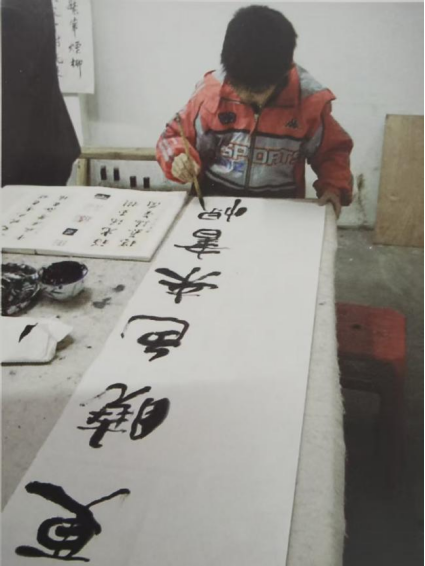 陈昊在挥毫,其作品在广东省青少年书法大赛中荣获“一等奖”。