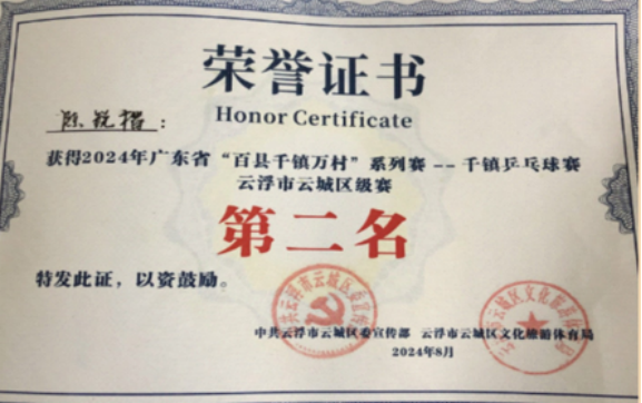 陈锐楷获得千镇乒乓球云浮市云城区级赛第二名