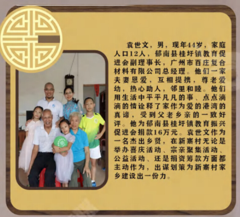 袁姓,汝南群,始祖原肇庆府封川县归仁乡(即今肇庆市封开县杏花镇),于康熙三十二年始祖迁到罗定州西宁县兴宁保第五区二甲新寨村(即今云浮市郁南县桂圩镇新寨村)富平社居住,耕读世业,至光绪十九年岁次癸已设立袁昌贵户(即明儒公之户),子孙税业,永远昌盛!
