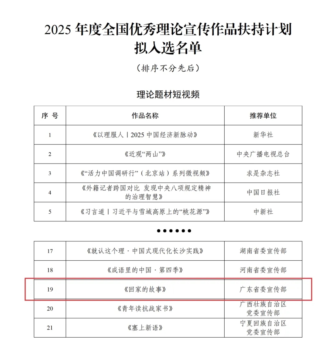近日,中国文明网公示2025年度全国优秀理论宣传作品扶持计划拟入选名单,由广东省委宣传部推荐的宣讲微视频《回家的故事》光荣上榜。这部作品曾于2024年入选全省优秀宣讲微视频,此次获得中宣部扶持。