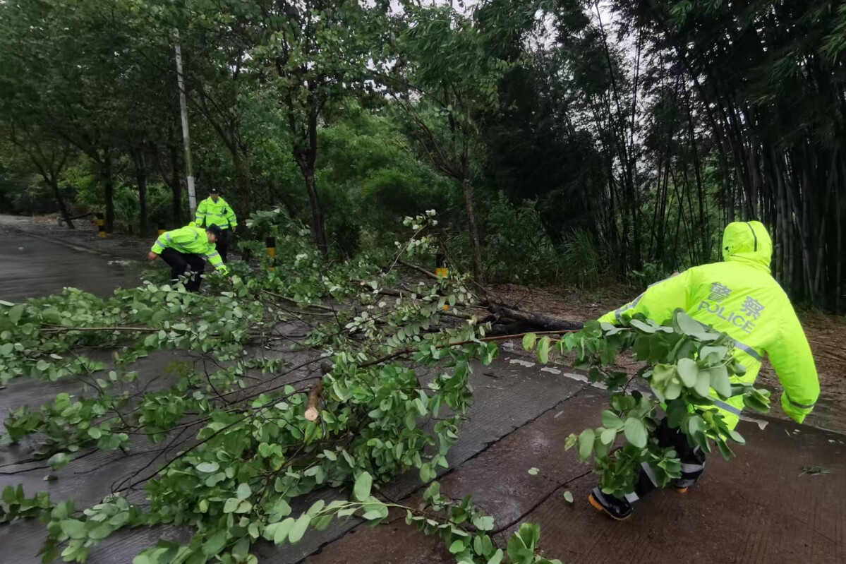 台风“桦加沙”来袭,干警清理路上倒伏树枝