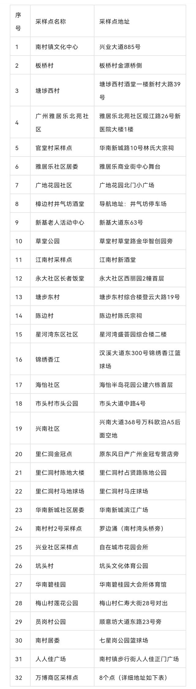 因疫情防控需要,根据统一安排,广州市番禺区南村镇定于今日(8月14日)对全镇户籍人口、来番人员开展大规模核酸检测工作,全镇设39个核酸检测点。