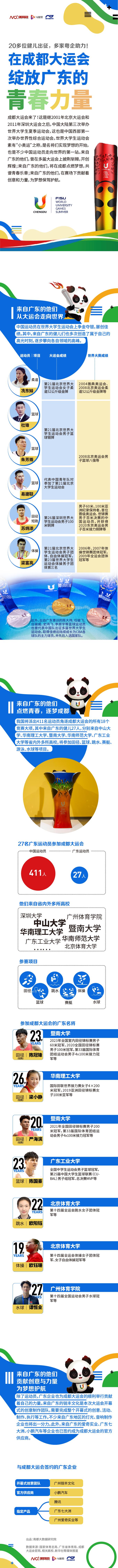 世界大学生运动会素有“小奥运”之称,是名将们实现梦想的开始,也是不少中国运动员走向世界的第一站。来自广东的他们,曾在多届大运会上披荆斩棘,开创辉煌;来自广东的他们,将在成都点燃梦想,共谱青春乐章;来自广东的他们,在赛场下贡献着创意和力量,为梦想保驾护航。