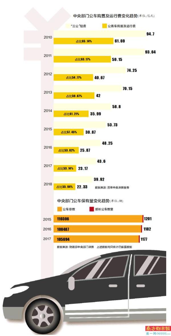 公车数量也持续下降。南都记者对近年来中央部门的公车保有量统计发现,仅2015年至2017年,中央部门的公车数量至少削减了4612辆。