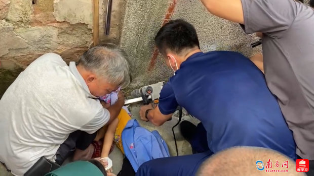由于铁钉扎进小孩头部且有一定深度,无法直接用外力强行将小孩救出,为避免对其造成二次伤害,消防救援人员决定先对墙角进行破拆,让嵌入的铁钉和被困小孩能同时移出。