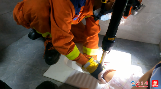 随后,消防救援人员先安抚小孩的情绪,同时用毛巾包住小孩脚裸,再利用破拆工具小心翼翼地将蹲便池敲碎,并用手将破碎的瓷片掏出。15分钟后,小男孩的右脚被成功取出。