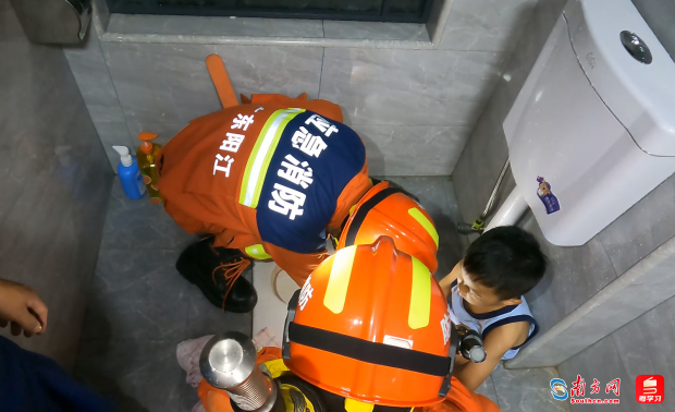 现场见男孩坐在地上,右脚卡在蹲便池中,无法拔出。消防救援人员尝试让男孩自行调节脚部的动作,看能否拉上来,但由于小孩喊痛,便就此作罢。