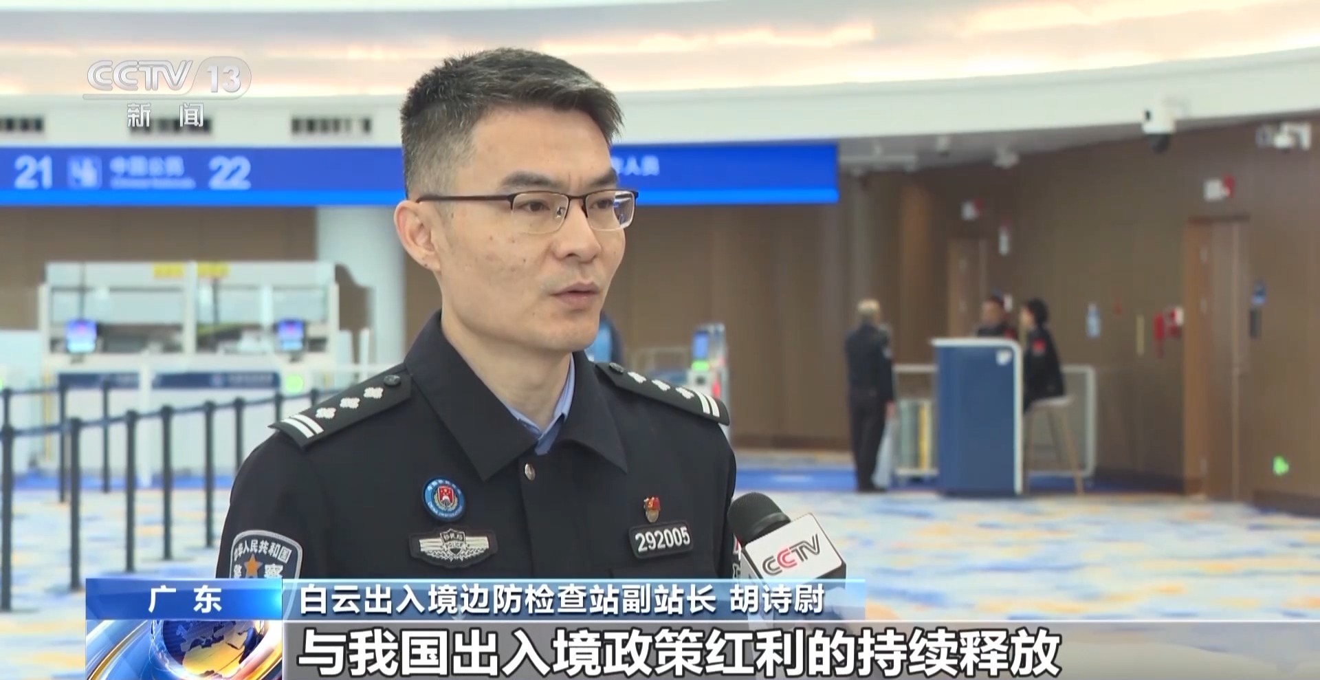 白云出入境边防检查站副站长 胡诗尉:不断增长的态势,与我国出入境政策红利的持续释放、免签不断扩容密切相关。截至2026年1月22日,白云机场口岸今年日均出入境客流超5.5万人次,居于高位,实现了“开门红”。伴随着2026年春运临近,预计口岸将迎来新一轮出入境客流高峰,单日出入境客流或达5.8万人次。