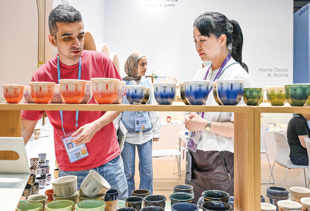 4月23日,境外采购商(左)在第139届广交会第二期日用瓷器展台洽谈。新华社记者邓华摄