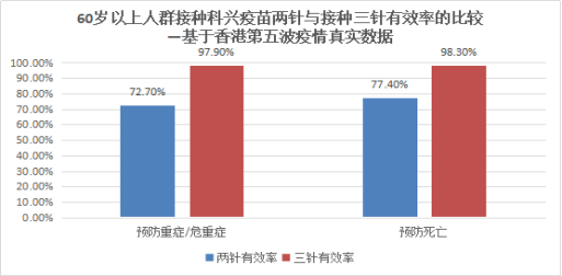 面对免疫逃逸能力极强的奥密克戎毒株,香港使用科兴疫苗在标准接种(全程接种)的人群,对于老年人预防重症/危重症和死亡保持着较强的效果,有效率达70%以上。而在第三针疫苗(加强针)接种后,保护力获得了全面提升,预防重症/危重症及死亡保持着强大的效力,有效率接近100%。