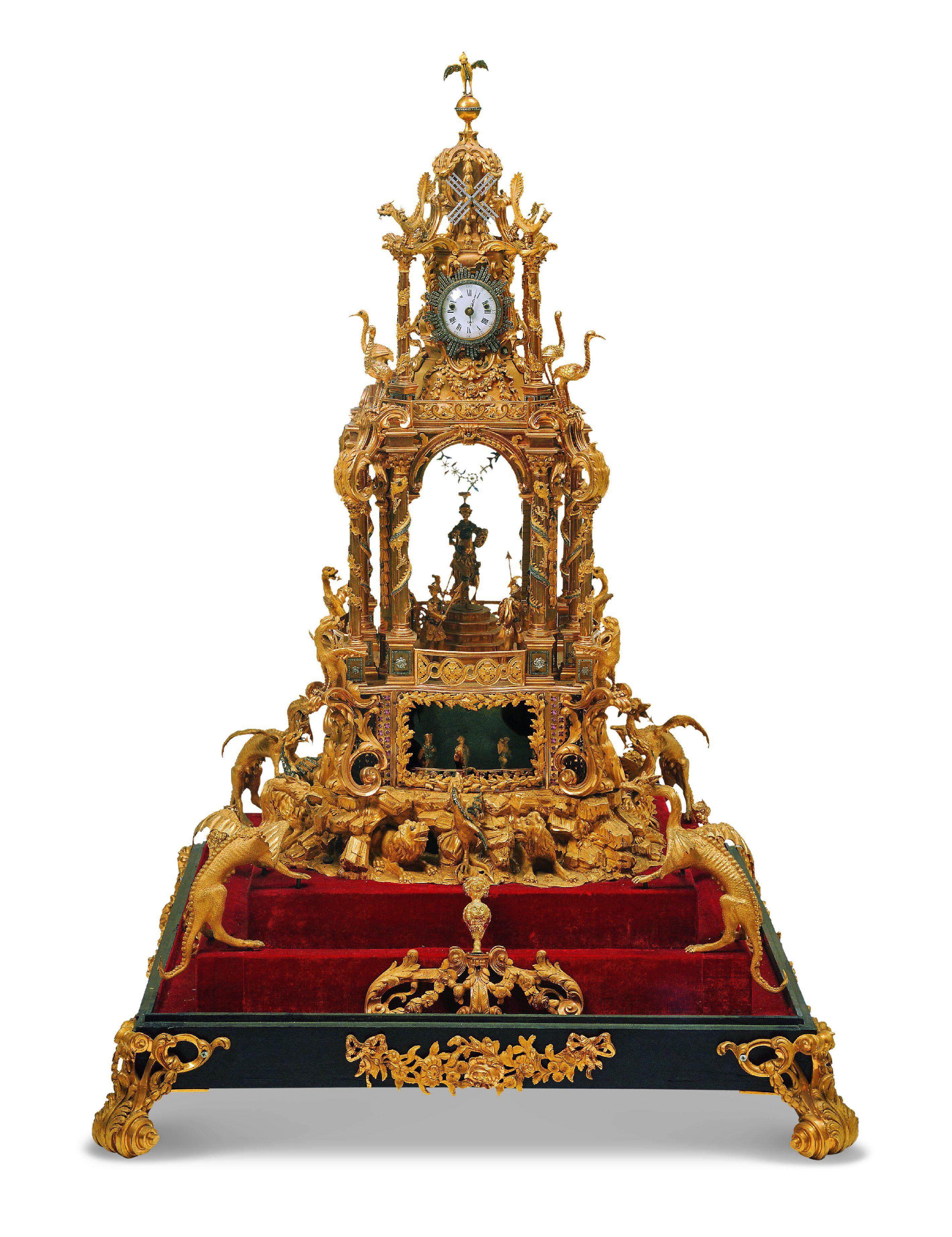 如此,当核心技术被掌握,属于中国人的浪漫时间表达,也应运而生。在造型艺术上,广钟整体外形多采用中国传统的亭台楼阁等建筑造型,或葫芦、花盆等吉祥器物;更令人拍案叫绝的是对内部机械自动人偶的改造。工匠利用多盘塔轮或发条带动齿轮系统,将西洋机械表演系统充分中国化,使其能定时展示“万寿无疆”“天官赐福”等条幅,以及“物华天宝,人杰地灵”等对联。当时广钟的技术水平已接近同时期欧洲制钟水平。