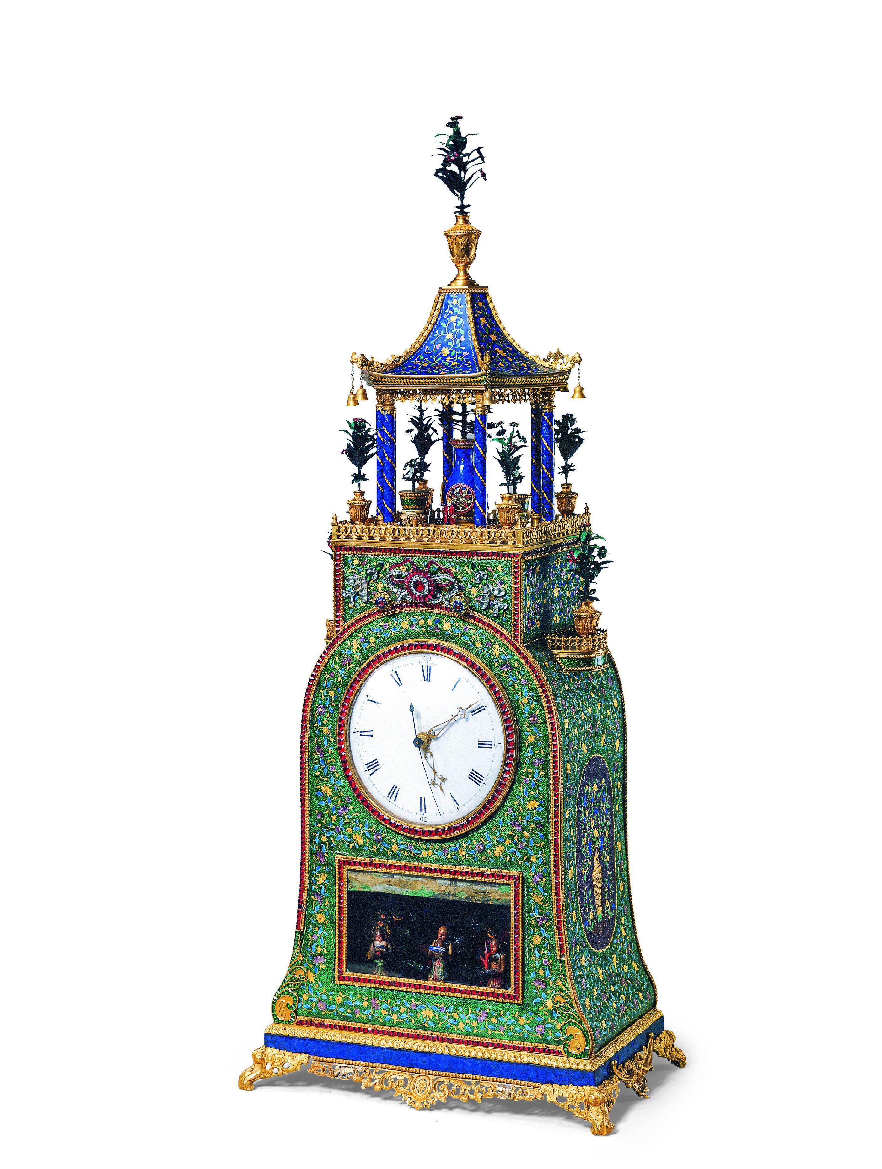 在这场交汇中,中国工艺技术也得到补充与完善,尤以珐琅工艺为甚。早在13世纪末,阿拉伯珐琅便传入中国,形成明代盛极一时的“景泰蓝”工艺及作品,但广钟使用的透明珐琅却另有渊源。