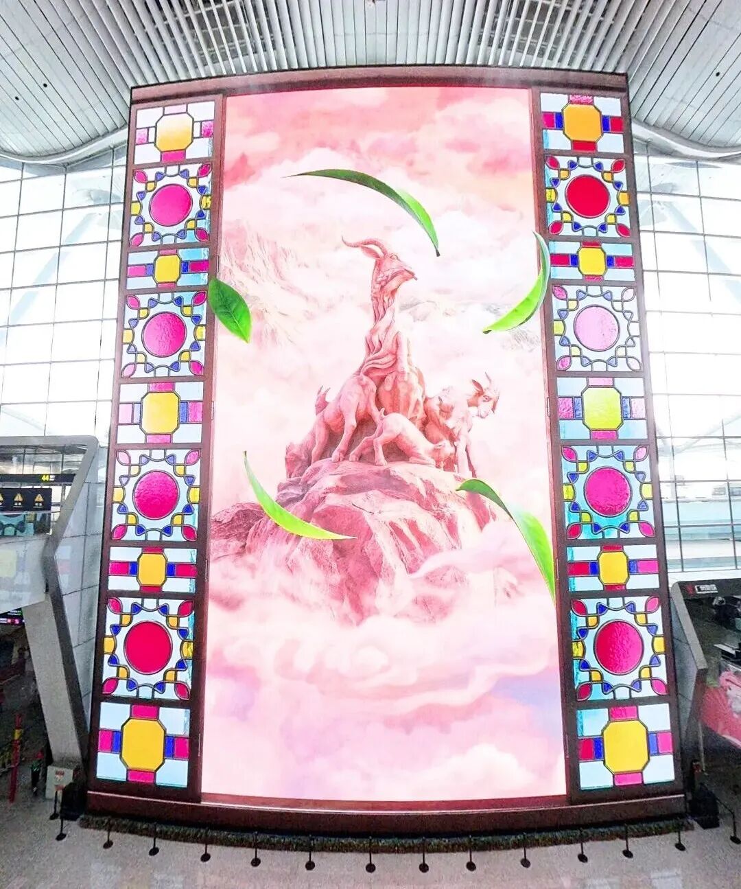 在“水景瀑布”场景里,象征广州千年城脉的“羊城三石”意象被巧妙植入山水之间。“广州之窗”则化身为动态的“满洲窗”,在光影开合中徐徐展开城市地标画卷。这些精心设计的充满广府味的视觉内容,将机场候机空间转化为可驻足欣赏、可沉浸体验的数字文化长廊,为旅客的候机时光增添别样风味。