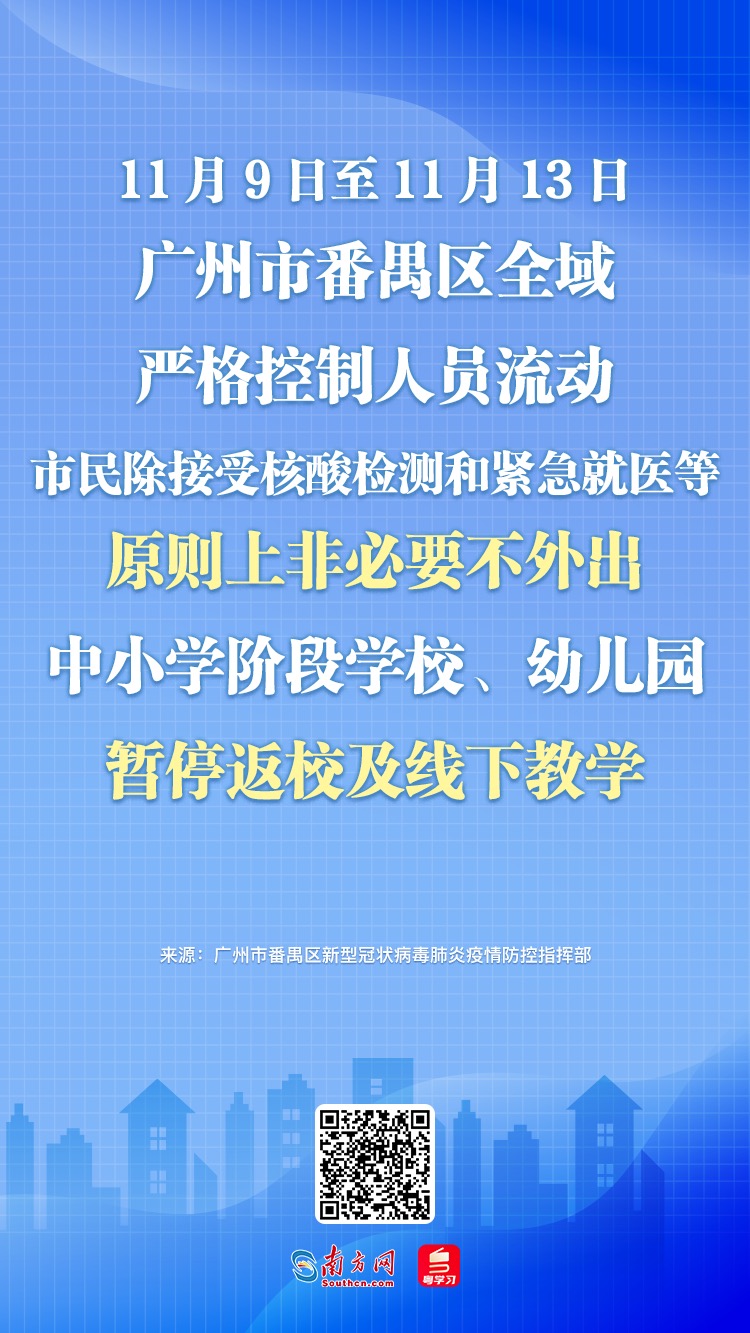 根据疫情处置进展,按照国务院应对新型冠状病毒肺炎疫情联防联控机制综合组《新型冠状病毒肺炎疫情防控方案(第九版)》的规定,经专家组综合研判,决定2022年11月9日至11月13日,在番禺区全域实行防控措施如下: