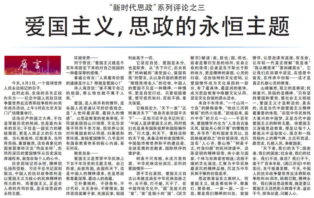 “天下者,我们的天下;国家者,我们的国家;社会者,我们的社会。我们不说,谁说?我们不干,谁干?”百余年前,《湘江评论》中的发问,至今振聋发聩。今天,中国人民抗日战争暨世界反法西斯战争胜利80周年,硝烟已散,精神永存。我们再论思政教育,就是要让爱国主义这把炬火辉煌于史、溢彩于今,照亮征途、闪耀人心。