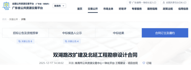 近日,珠海市公共资源交易中心发布《双湖路改扩建及北延工程勘察设计合同公告》(以下简称《公告》)。该工程进入勘察设计阶段,标志着项目建设进入技术准备的核心环节,从概念规划向实际实施迈出了坚实一步。