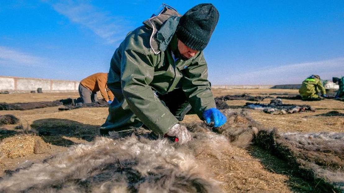 图为玛祖铭立团队给牦牛皮剪毛。受访者供图