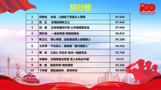 决赛现场,10名选手立足本职工作,结合自身经历,紧紧围绕“老兵永远跟党走”主题,用生动的语言、鲜活的事例、真实的情感,抒发出退役军人对党的忠诚与热爱,表达了退役军人工作者对事业的热忱与执着。来自省退役军人事务厅的柳俊、珠海市退役军人事务局的陈卫儿,分别讲述了如何用心用情服务好退役军人,如何当好退役军人的娘家人。来自省公安厅的符铁柱,满怀深情地讲述了自己别了军营又入警营,退役不褪色、离队不离党的故事。来自广州的刘涛,将自己一家三代军人的故事娓娓道来,让我们看到了传承红色基因、赓续红色血脉,革命军人永远听党话、跟党走的坚定信仰。来自肇庆的贾东亮讲述了自己退役后带领乡亲们不懈奋斗、勤劳致富的艰辛历程,表达了投身乡村振兴的决心和信心。
