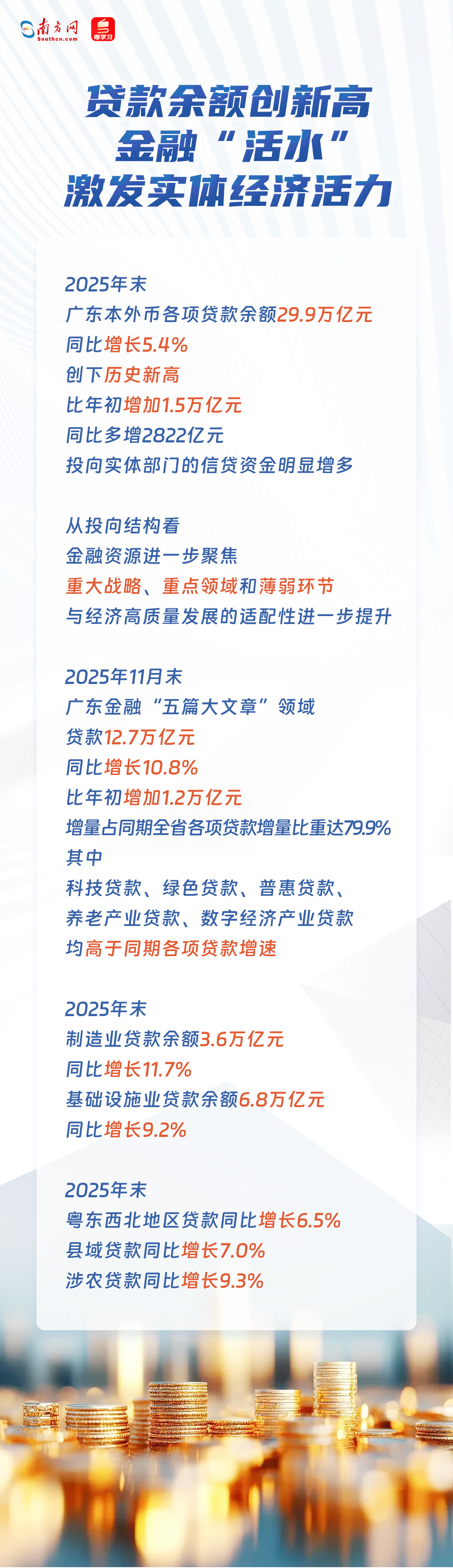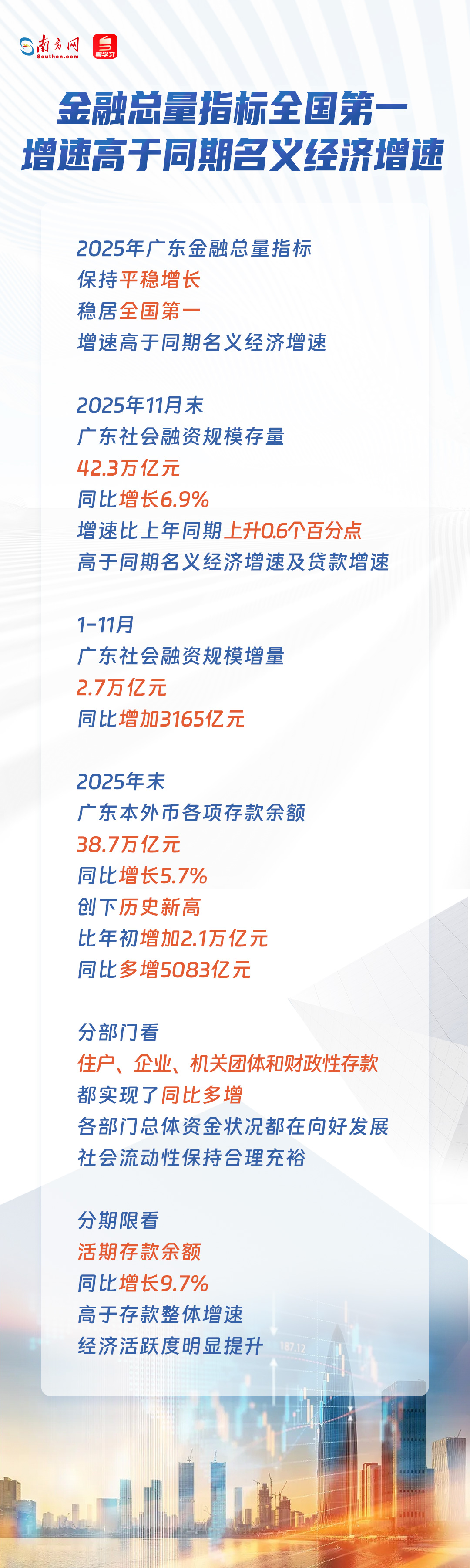 1月16日,中国人民银行广东省分行发布2025年广东金融运行情况。广东金融总量指标保持平稳增长、稳居全国第一,增速高于同期名义经济增速。2025年末,广东本外币各项存款余额、贷款余额双双创历史新高。通过一组海报,速览这份亮眼成果!