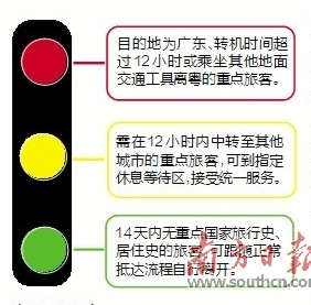“红色”代表目的地为广东、转机时间超过12小时或乘坐其他地面交通工具(火车、客车)离粤的重点旅客;“黄色”代表需在12小时内中转至其他城市的重点旅客;“绿色”代表14天内无重点国家旅行史、居住史的旅客。