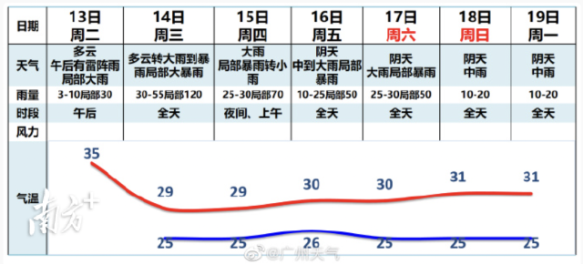 13日夜间-16日,广东大部分市县有大雨到暴雨局部(特)大暴雨,雷雨时局地伴有短时强降水和 8 级~10 级大风等强对流天气。