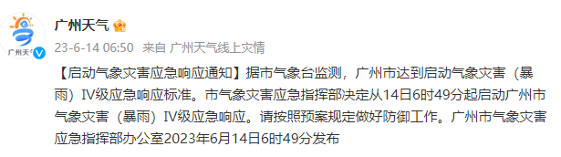 端午将至,广州高温与暴雨一起到来。广州市气象灾害应急指挥部办公室2023年6月14日6时49分发布消息,据市气象台监测,广州市达到启动气象灾害(暴雨)Ⅳ级应急响应标准。市气象灾害应急指挥部决定从14日6时49分起启动广州市气象灾害(暴雨)Ⅳ级应急响应。请按照预案规定做好防御工作。