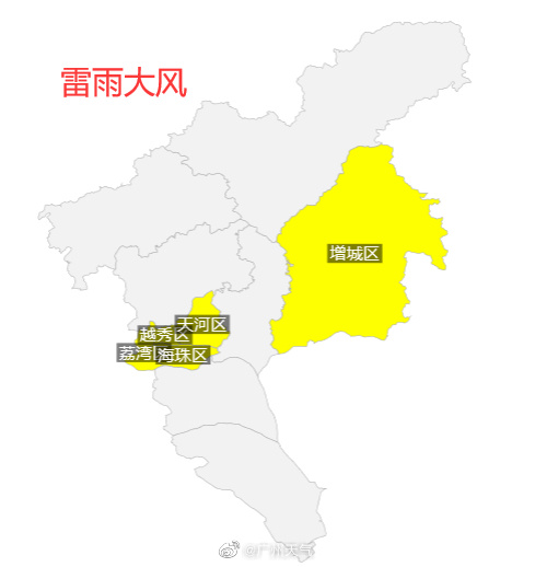 现在广州各区预警生效情况如下图所示,目前暴雨云团位于广州市区、番禺、增城、从化,影响时间大致还有1-2小时。