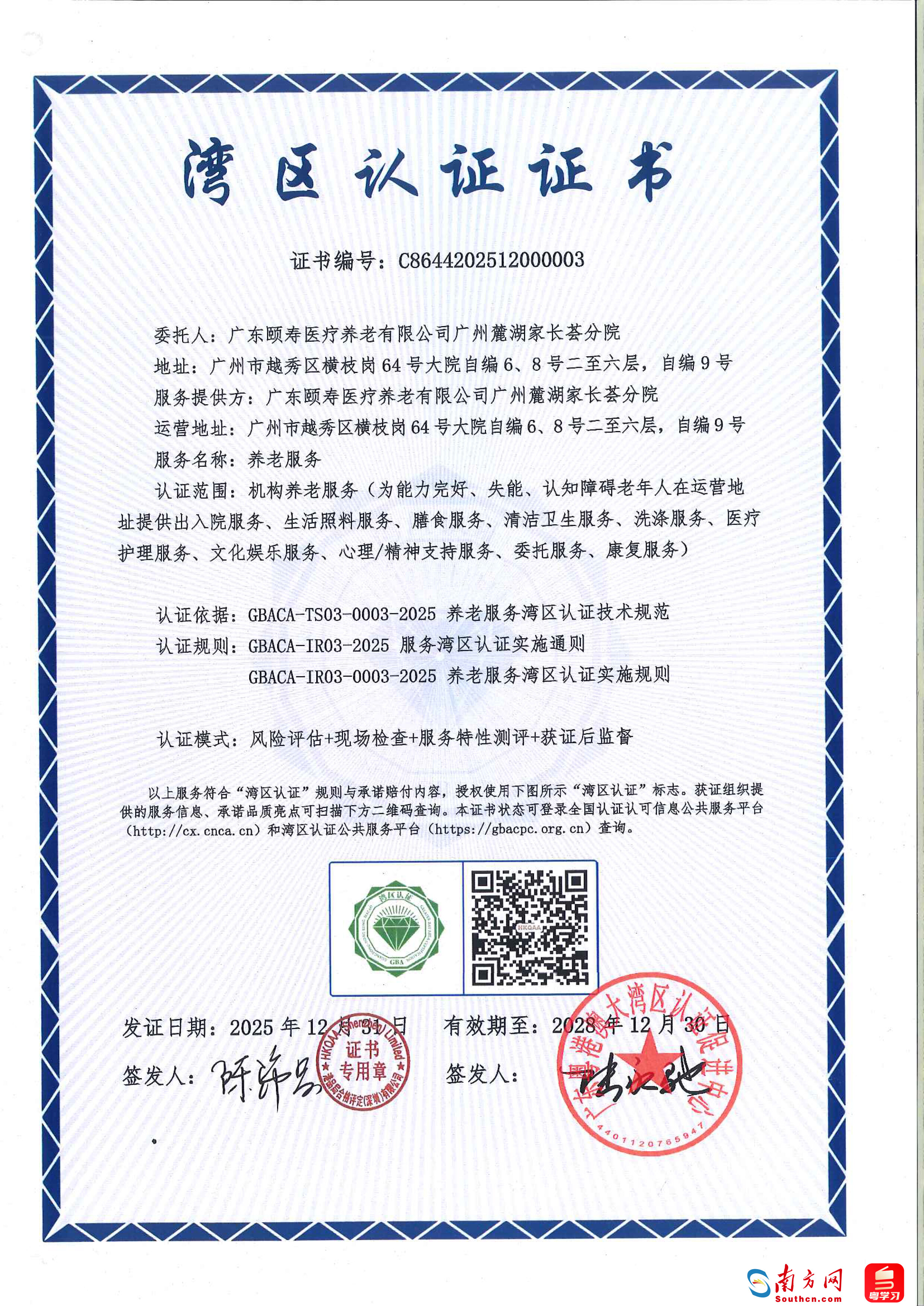 本次获证的广东颐寿医疗养老有限公司广州麓湖家长荟分院是香港“广东院舍照顾服务计划”认可服务机构,该院积极引入“湾区认证”规则,通过建立全时、全程、全方位的智能管理与服务体系,致力为长者提供集医康养护、文娱旅教及智慧保障于一体的优质服务。