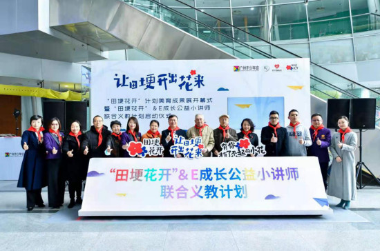 12月20日上午,“田埂花开”计划美育成果展开幕式暨“田埂花开”&E成长公益小讲师联合义教计划启动仪式在广州市第二少年宫举行。广东省时代公益基金会与广州市少年宫联合主办了此次活动。原广州市副市长、现广州市书画艺术鉴赏交流学会会长郭向阳,原广州市副市长刘锦湘,广东省民政厅副厅长庄侃,广东省妇女联合会副主席罗敏,广东省妇女儿童基金会秘书长梁小钊,广东省教育厅体卫艺处主任李俊以,广东省青少年发展基金会秘书长吴阳平,广州市文联创作部部长刘兰,广州市少先队总辅导员张海波,广州市少年宫常务副主任关小蕾,时代基金会理事长李玲玲,理事李娟、赵趄等嘉宾出席了开幕式。
