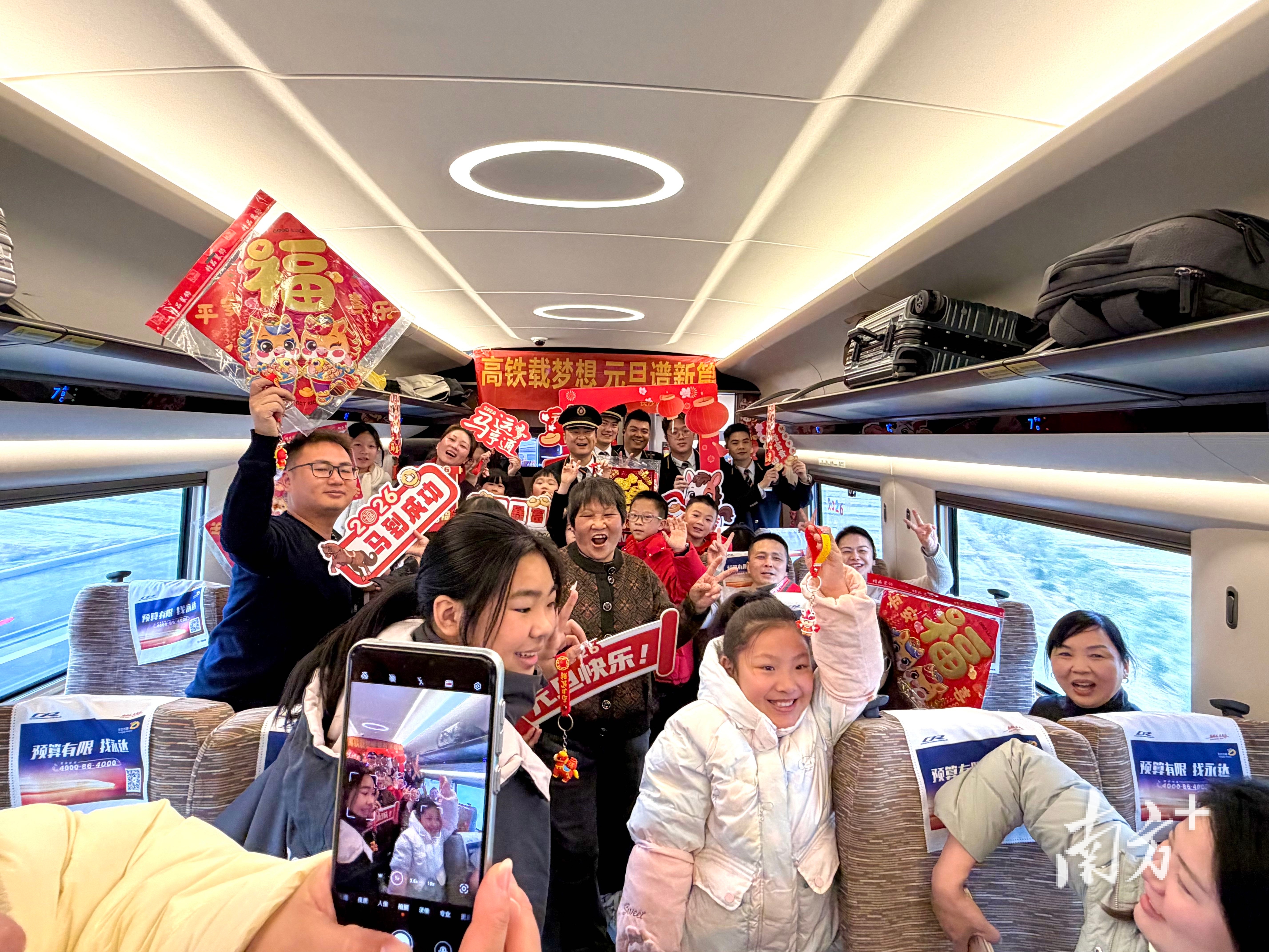 广湛高铁列车上,也洋溢着浓浓的节日气息。G5237次复兴号列车上还举办了跨年有奖问答活动热。“广湛高铁全线最长的隧道叫什么名字?”列车长李玉洁的提问刚落,湛江籍大学生小张反应最快抢先回答出“公岭隧道”,身旁的乘务员立刻送上了刻有湛江海湾大桥线条的黄铜书签。“书签上的海湾大桥太有家乡味了,元旦回家仪式感直接拉满!”小张高兴地说。