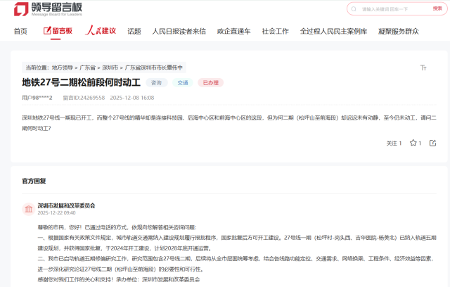 与之形成对比的是,在网友问及27号线二期时,深圳市发改委在回复中明确了27号线二期已纳入五期修编研究范围。目前,该线路一期(松坪村-岗头西,吉华医院-杨美北)已纳入轨道五期建设规划,并获得国家批复,于2024年开工建设,计划2028年底开通运营。在深圳轨道五期修编研究工作中,研究范围包含27号线二期,后续将从全市层面统筹考虑,结合各线路功能定位,交通需求,网络换乘,工程条件,经济效益等因素,进一步深化研究论证27号线二期(松坪山至前海段)的必要性和可行性。