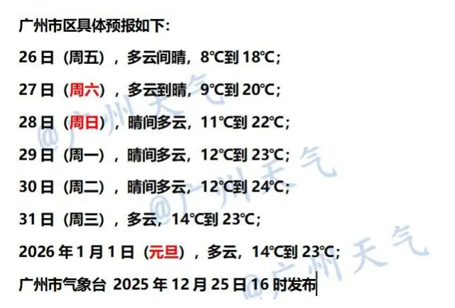目前明确的是,2025年12月31日至2026年1月2日,广州逐渐转受东南气流影响,云量增多,偶有小雨,最低气温上升。