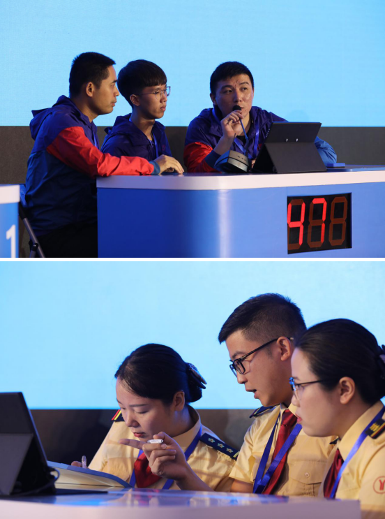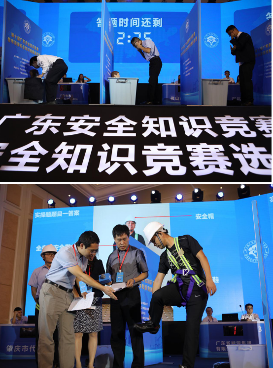 决赛共分四个回合进行,分别为“必答题”、“短片题”、“抢答题”和“实操题”,竞赛中既检验参赛队员个人对安全生产、职业卫生知识理论常识的掌握程度,也考验了竞赛队伍在安全生产中的团队合作精神,更考验参赛队员发现隐患问题、穿戴操作安全装备器材等防范和抗御事故灾害的综合素质能力。比赛一开始,8支代表队稳扎稳打,都没有在“必答题”环节中失分。在“短片题”环节,陆续有代表队出现丢分现象,逐渐形成了以广东省能源集团有限公司代表队和深圳市代表队为主的第一梯队。经过随后的“抢答题”“实操题”环节的激烈比拼,深圳市代表队和广东省能源集团有限公司代表队成功守住优势,摘下桂冠,将代表广东省“第十届粤港澳安全知识竞赛总决赛”。
