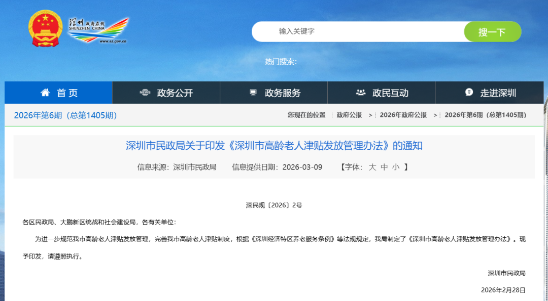 据了解,《深圳市高龄老人津贴发放管理办法》(以下简称《办法》)已于近日起正式施行。
