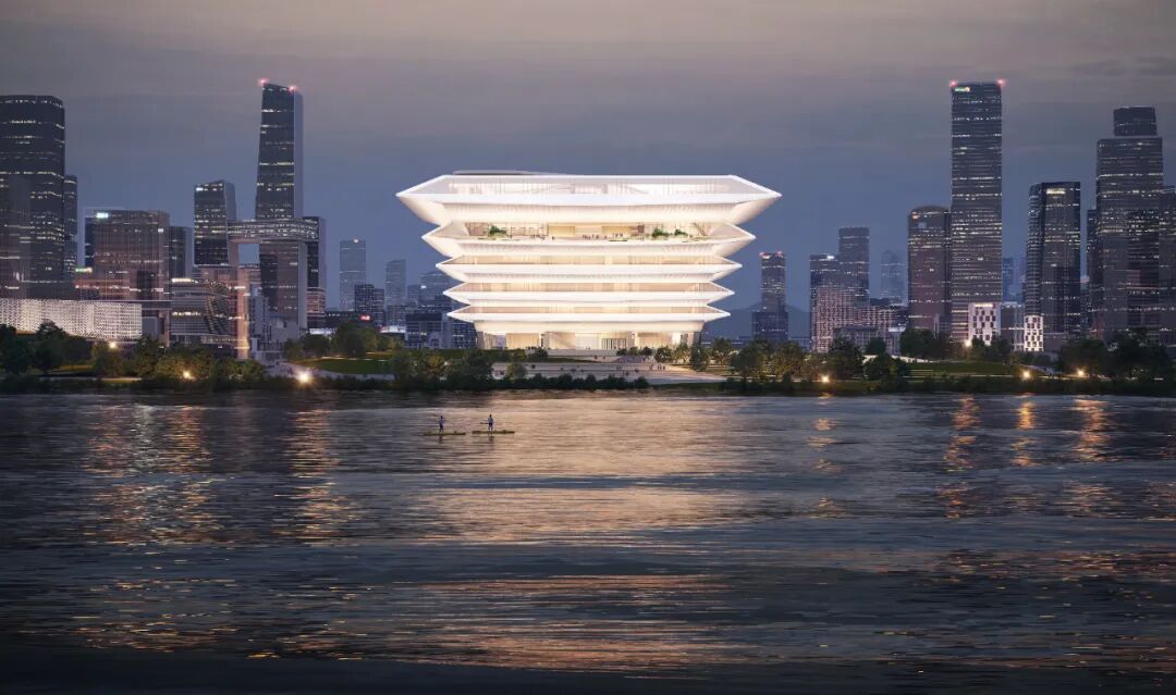 建筑内部设有超高“城市客厅”、五层全景式“山海剧场”、屋顶“绿心花园”营造丰富的文化体验。