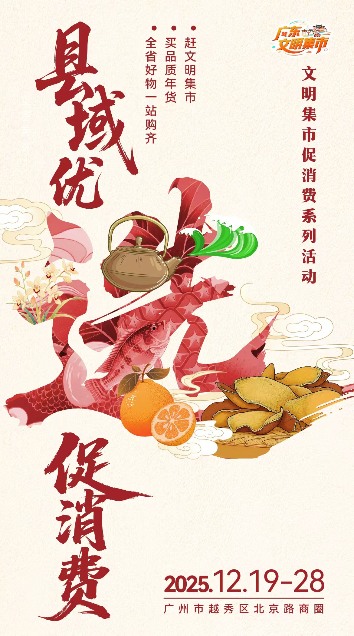 岁末将至,年味渐浓。一场融汇传统非遗、城乡优品、匠心技艺、文旅推介的文明集市即将盛大开市。12月19日至28日,文明集市促消费系列活动将在广州市北京路商圈举办,其中启动仪式定于19日在广州天河城南广场举办。系列活动将充分发挥文明集市接地气、聚人气、添活力的优势,围绕促消费、链市场、展现广东文明乡风和呈现“百千万工程”新成效三大重点,通过文旅推介、地市展销、快闪展演等形式,为市民游客们带来全新的消费体验,努力打造多元化消费场景的新名片、农文旅商融合发展的新模式、展示“百千万工程”发展成效的新窗口。
