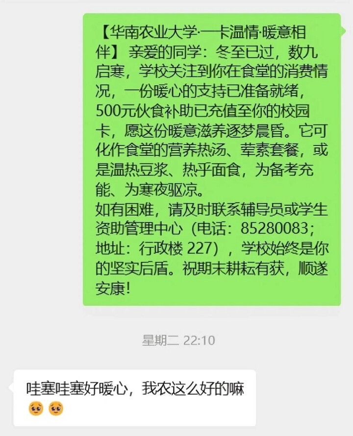 “同学,注意到你在食堂的消费情况,一份暖心的支持已就位,500元伙食补助已为你充值至校园卡。”近日,华南农业大学(下称“华农”)不少学生收到了这样一条温情短信,随之而来的是校园卡内悄然到账的伙食补助。这份无需申请的资助,让不少同学倍感温暖,纷纷点赞。