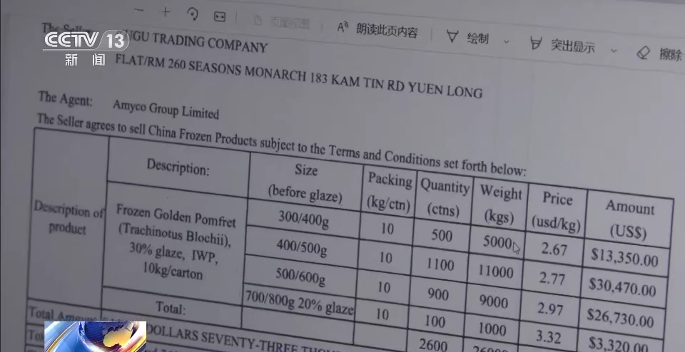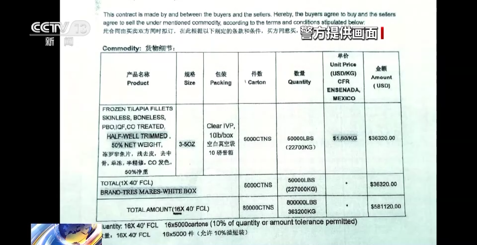 湛江海关缉私局茂名分局四级高级警长 李忠:你看它合同的编号,商品的品名、规格、型号和重量都是一样的,只是单价差别很大,真正的销售成交价格是每公斤是1.8美元,而虚假的合同上销售价格是4.92美元,这个高报的幅度超过了200%。
