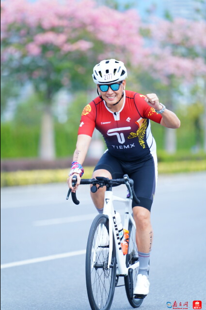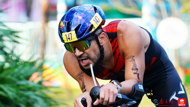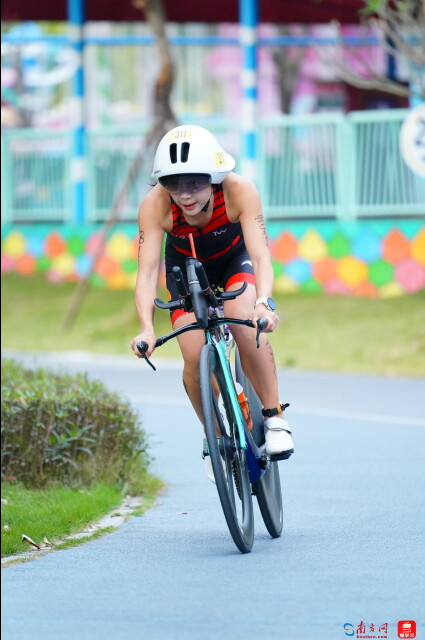 澄澈砚阳湖内,选手劈波斩浪开启征程;蜿蜒碧道之上,自行车编队风驰电掣,尽览城景与绿意;跑步赛道旁繁花相伴。
