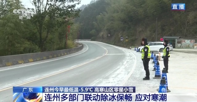 总台记者 王思元:今天早晨,广东连州南风坳记录到的最低气温是-5.9℃,这是本轮寒潮来袭后广东省内记录到的最低气温。从今天上午到下午,连州大部分乡镇出现雨夹雪,高寒山区还出现了零星小雪。目前,连州市区温度约为3.5℃。南风坳-5℃左右,连州寒冷红色、道路结冰黄色预警信号持续生效中。