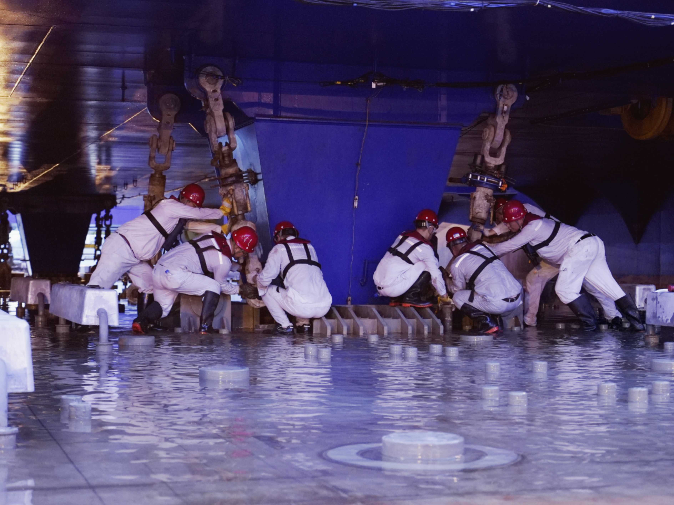 深中通道建设者正在船舱内,进行E20管节沉放安装作业(摄影:曹瀚文)