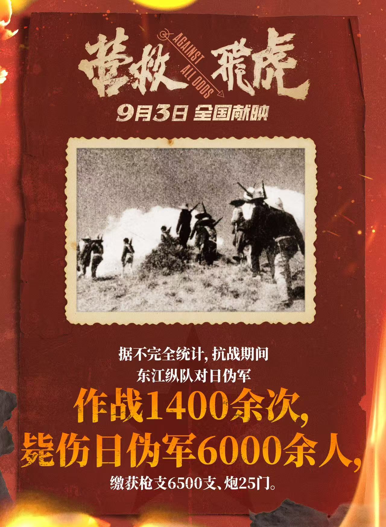 取材于东江纵队营救美军飞行员真实历史的电影《营救飞虎》,将于9月3日中国人民抗日战争暨世界反法西斯战争胜利80周年纪念日当天登陆全国院线。该片由华夏电影发行有限责任公司出品,中共惠州市委宣传部联合摄制,并在惠州实地取景,再现烽火岁月中的英雄传奇。