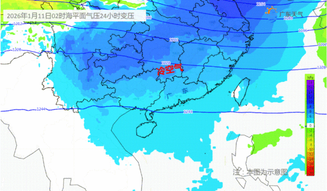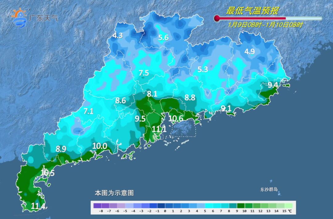 进入“三九”了,广东未来几天还会更冷吗?今明两天(8-9日),影响广东的冷空气(地面冷高压)逐渐减弱,白天阳光和暖,最高气温有所回升,但早晨晴空辐射效应明显,早晚寒冷,粤北和珠三角北部有大范围5℃以下低温,部分市县有霜冻或冰冻,昼夜温差大。10日白天云量增加,气温回升,夜间起新一股冷空气补充影响广东,但由于引导冷空气南下的高空槽纬度偏北,这股冷空气的影响不会特别强,11日白天广东省各地的最高气温有小幅下降,早晚依然较寒冷。