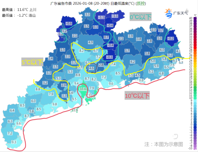 展望12日,随着冷空气逐渐东移出海,广东东南部沿海地区受高压后部偏南气流影响,云量增多,局部有零星小雨,但早晚仍较寒冷,而北部的冷空气“余威”仍在,粤北偏北市县有5℃以下低温。总的来说,未来几天“阿冷”影响仍活跃,气温波动,但早晚寒冷、昼夜温差大的“主调”还是没变的,高海拔山区有霜冻或冰冻,防寒保暖仍不能松懈。具体天气预报9日,广东省大部晴间多云。最低气温:粤北、珠三角北部市县0~5℃,其中高海拔山区-3~0℃,部分市县有霜冻或冰冻,雷州半岛南部市县10~12℃,其余市县5~9℃。