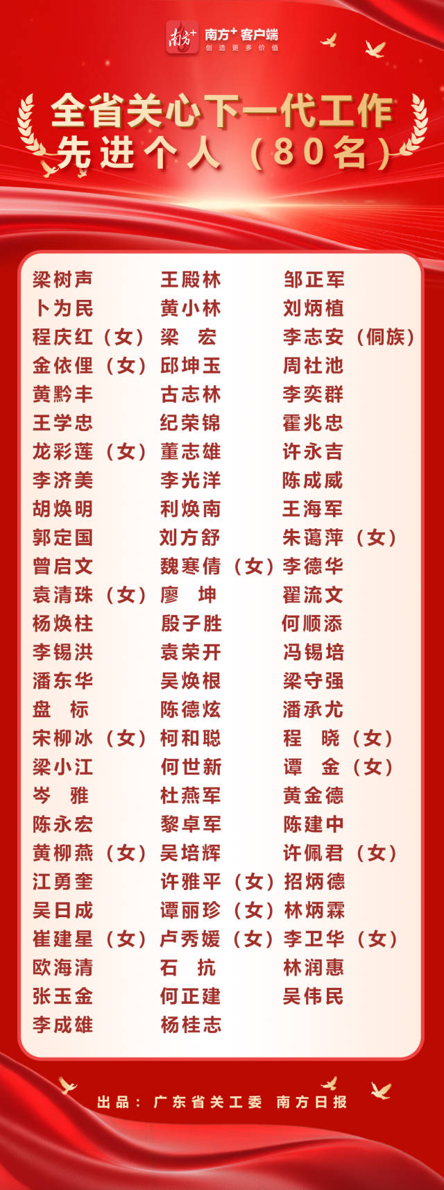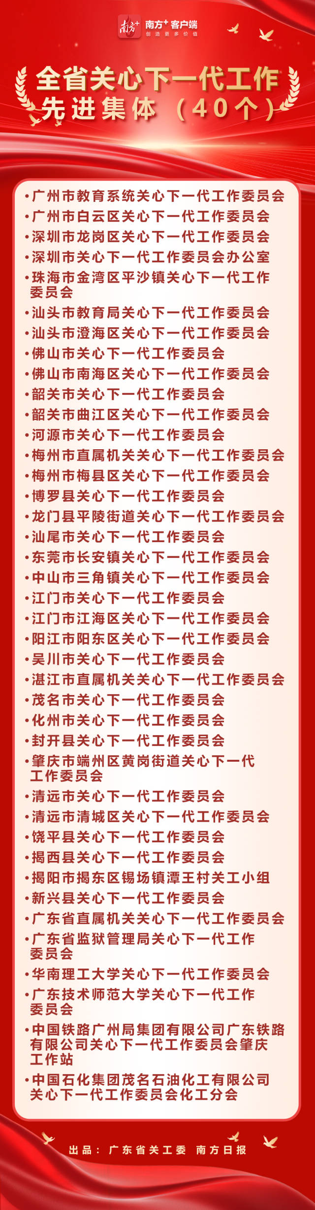 为表彰先进、树立典型,激励各级关工委和广大“五老”奋进新征程、建功新时代,推动我省关心下一代事业蓬勃发展,省关工委和省文明办决定:授予广州市教育系统关心下一代工作委员会等40个单位“全省关心下一代工作先进集体”称号,授予王殿林等80名同志“全省关心下一代工作先进个人”称号。