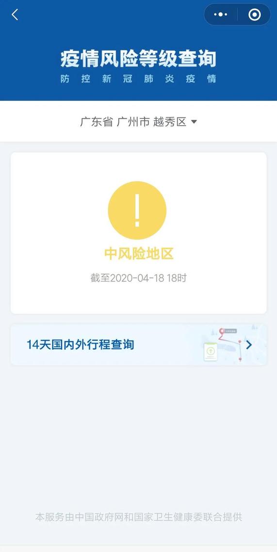 我们采用公开数据说话,用国家卫健委的“疫情风险等级查询”小程序查了一下广州市越秀区的风险,是中风险地区,查了一下深圳宝安区,是低风险地区,又查了一下北京市朝阳区,是高风险地区(查询方法:关注“中国政府网”,选择菜单里的“疫情服务”-“服务专区”,进入服务专区后自动跳转到国务院客户端,点击“疫情风险查询”,即可选择地区查询)。
